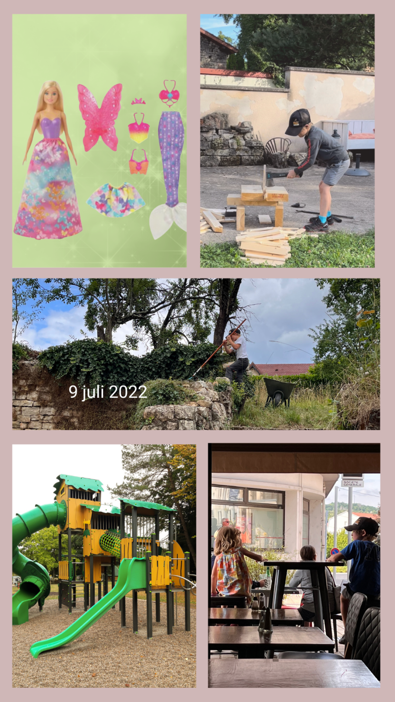 Zoon M. (5 going on 6) heeft direct bij aankomst al allerlei gereedschap gespot dat veel leuker is dan speelgoed. Vandaag mag het eindelijk! Direct na het ontbijt staat hij als een echte werkman klaar met kloofbijl, zaag en houtjes. Alleen de heupgordel om gereedschap in te bewaren ontbreekt. Ouders B. hebben wij uit hardlopen gestuurd zodat wij de kinderen kunnen aanzetten tot kinderarbeid. De man toont zich een geweldige leraar en in no time hakt M. een indrukwekkende stapel aanmaakhoutjes. Kleine handjes zijn ook heel handig om het onkruid tussen de pavé uit te pulken, dus die klus kan ook mooi gedaan worden door M.