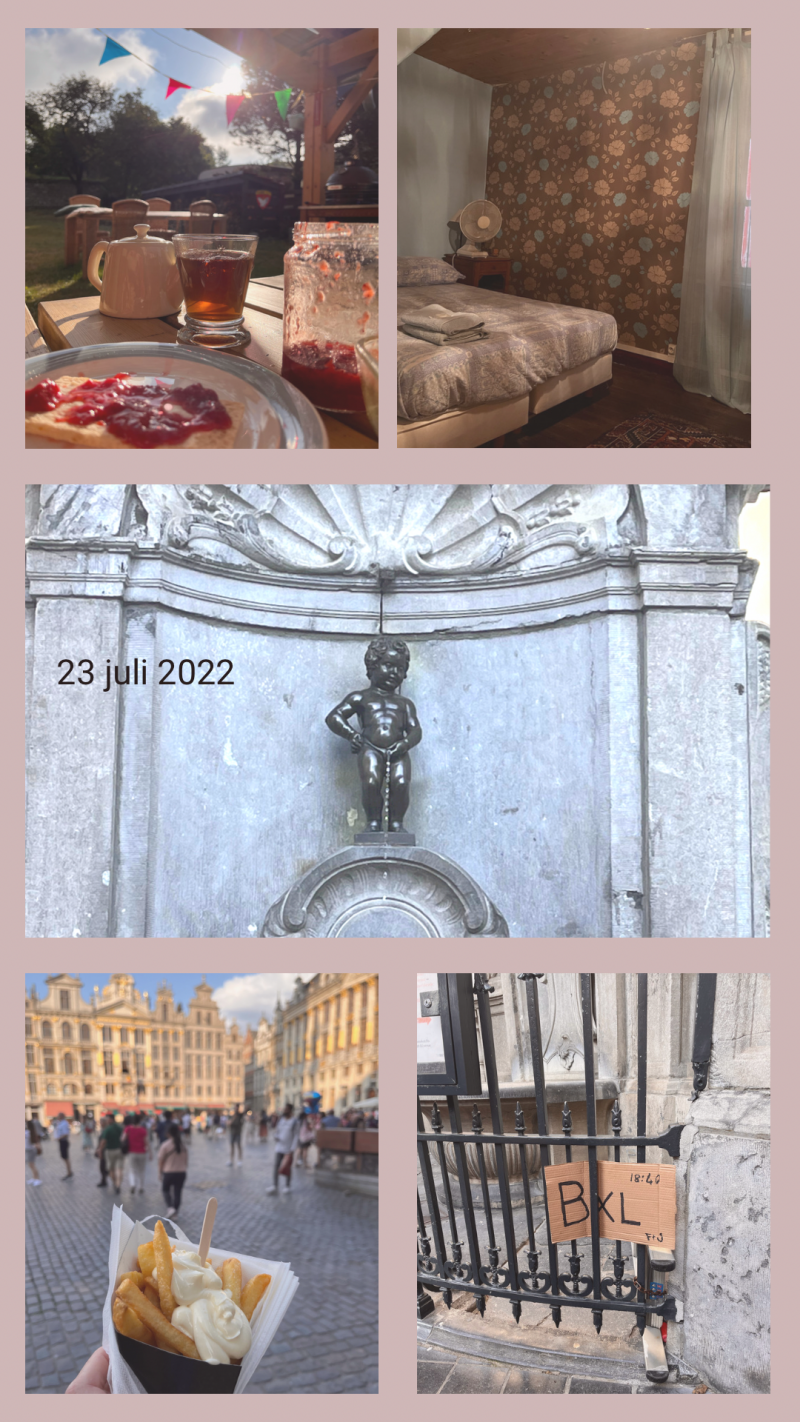 In Brussel heb ik 2 opties. Ze ergens afzetten of nog 10 minuten de stad in rijden tot bij Manneken Pis. Nu ik toch al in hartje Brussel ben is dit een goed moment om mijn weerstand tegen Brussel te overwinnen. Deze is ontstaan toen ik nog regelmatig naar de Ambassade van Burkina Faso moest en steevast verdwaalde en vast kwam te zitten in de stad. Dit, in combinatie met de stress om op tijd te zijn voor het krappe tijdframe waarbinnen je de aanvraag moest doen, was hèt recept voor een negatieve herinnering aan Brussel. Met navigatie en 30 jaar meer rij-ervaring blijkt het helemaal niet zo ingewikkeld. Ik vergaap me aan mooie gebouwen en parken die ik tegenkom. De tactiek om altijd de middelste baan aan te houden blijkt wel nog steeds effectief. Een grote gratis parkeerplek, vlak voor het Manneken lijkt ons op te wachten. De lifters rennen naar de finish, maar helaas, helaas er komt een ander team al aangerend van de andere kant en finisht een fractie eerder! Hoewel ik officieel niks met de Challenge te maken heb, voelt het toch een beetje als een nederlaag. Wat als... ik iets korter gepauzeerd had, of iets eerder bij Contrex was geweest (ze stonden er immers al bijna een uur). Maar dan blijkt dat team 1 er al 20 minuten is. We maken foto's, nemen afscheid. Ik besluit dat mijn auto daar prima geparkeerd staat en gun mezelf een kort wandelingetje door centrum Brussel. In de zwoele zomeravond eet ik een frietje op Grand-Place, doe een wens bij t'Serclaes relief waar de legende van zegt dat wrijven over de rechterarm zorgt dat je terugkeert naar Brussel, koop wafels en neem mij voor dat de volgende City-trip naar Brussel moet gaan.